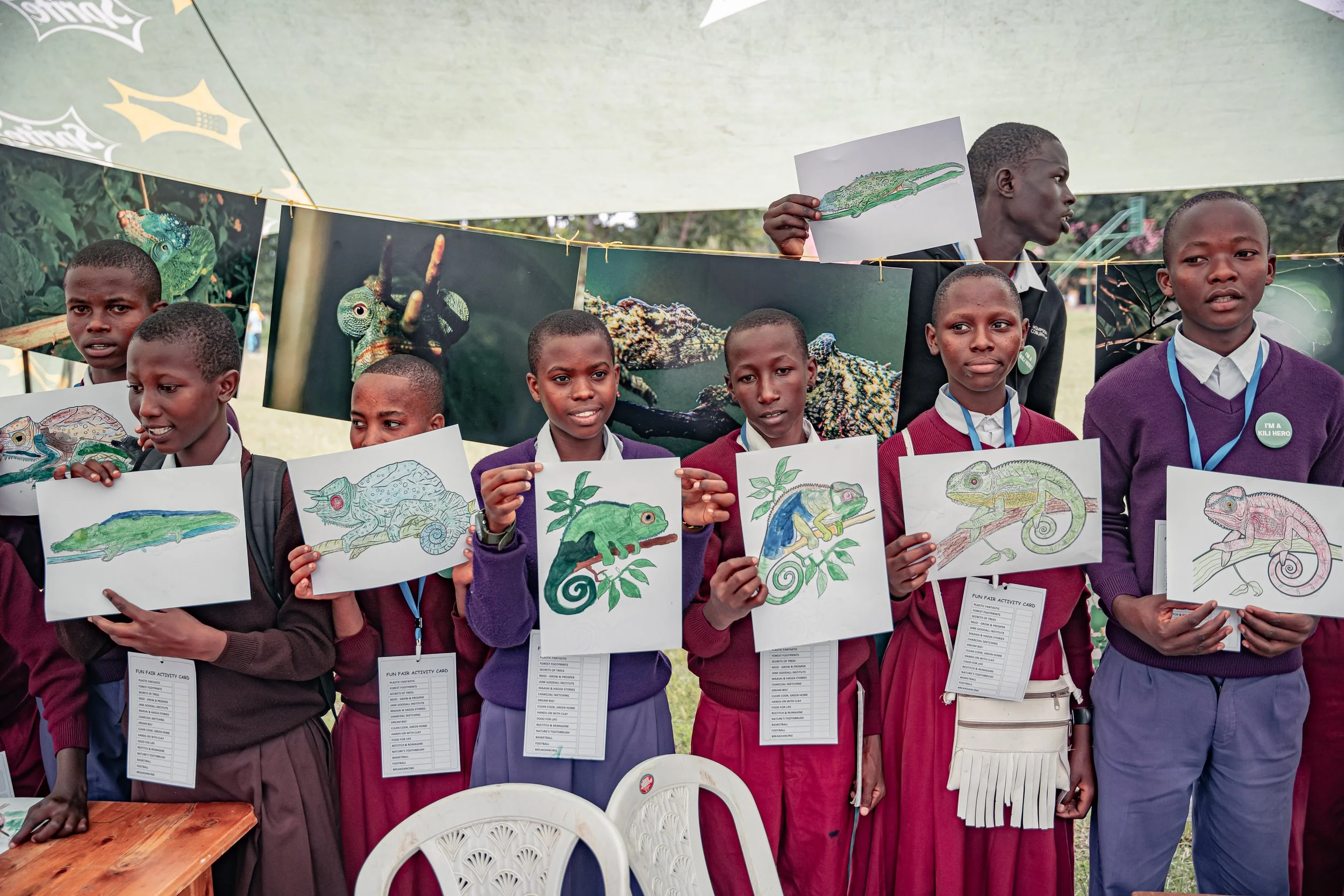 Our Chameleon Art Tent used creativity and conversation to shift how children see chameleons. We began by asking about their fears and fascinations, then shared fun facts — including that Tanzania is home to 47 species, the second-highest in the world. This not only surprised them but also sparked national pride.